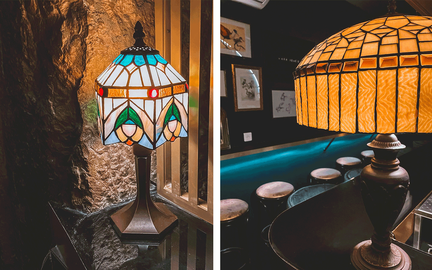 Diplômée des Beaux-Arts, Charlotte a pensé, dessiné, et confectionné elle-même tout ce décor velouté. Lumière tamisée, ambiance trendy et musique jazzy : nous avons succombé dès le premier regard… A travers ce voyage clandestin dans un passé américain fantasmé des années 30, La Baignoire nous immerge dans une petite bulle intimiste, agrémentée de lampes Tiffany (style Art Déco), de fleurs séchées et de quelques curiosités…